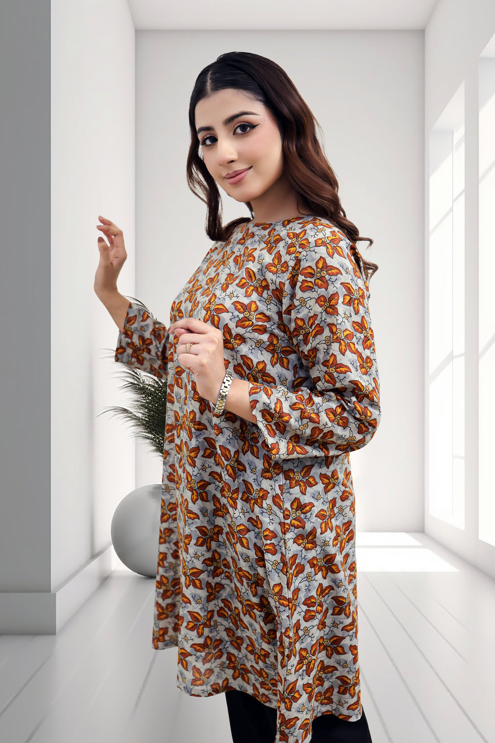 Stunning Amber Blossom Print: Adorned with a vibrant, eye-catching pattern of orange and yellow floral motifs set against a subtle off-white or light gray base, perfect for all-day wear.