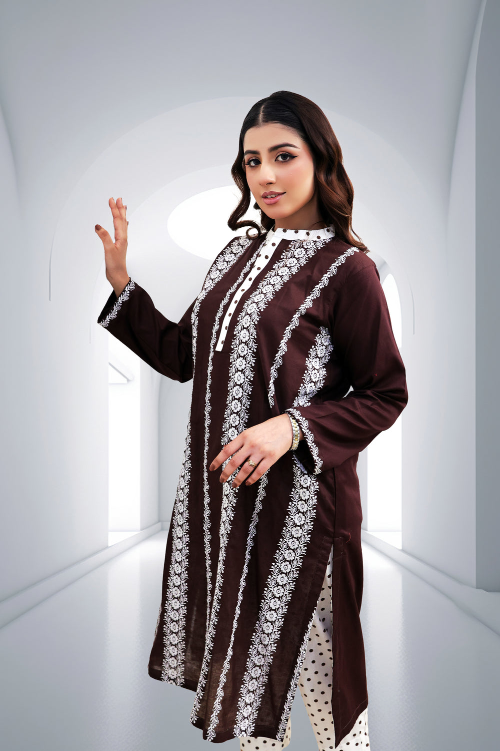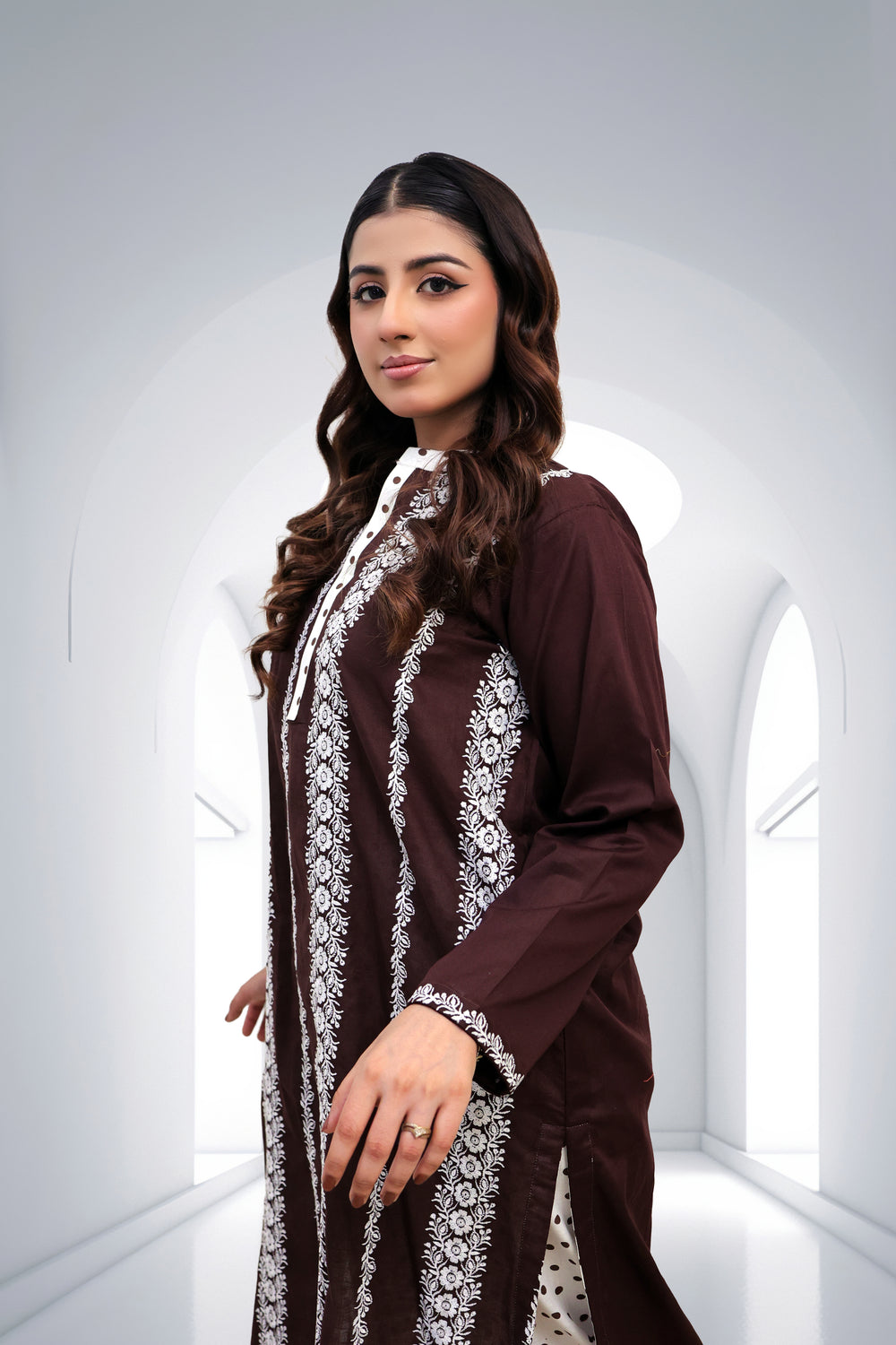 Intricate White Embroidery: Features exquisite, detailed white threadwork along the placket and bodice, offering a striking contrast against the rich cocoa-brown base.