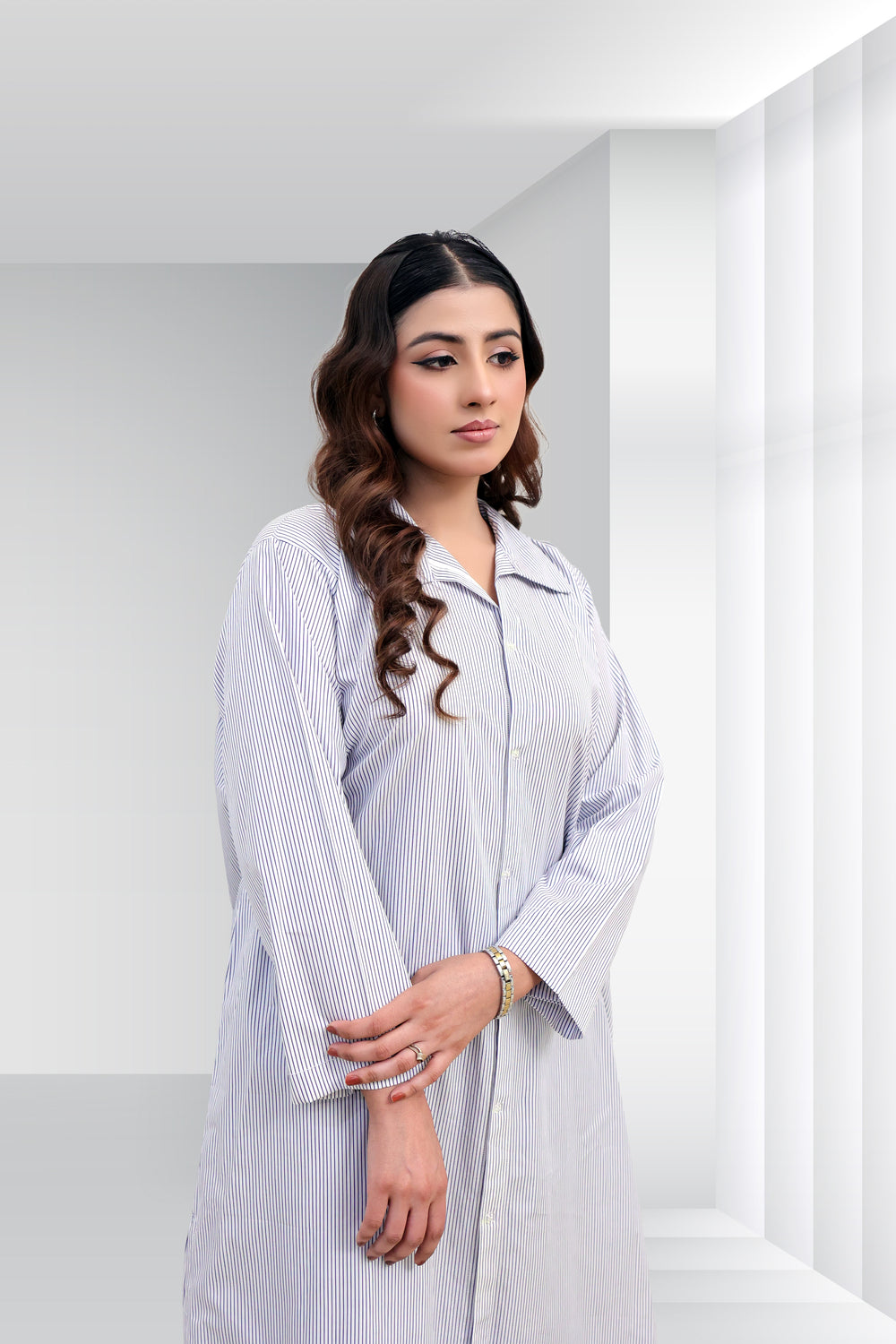 🔸 Shop the Classic Striped Button-Down Long Shirt in the UAE, featuring elegant vertical stripes and a refined, modest design.