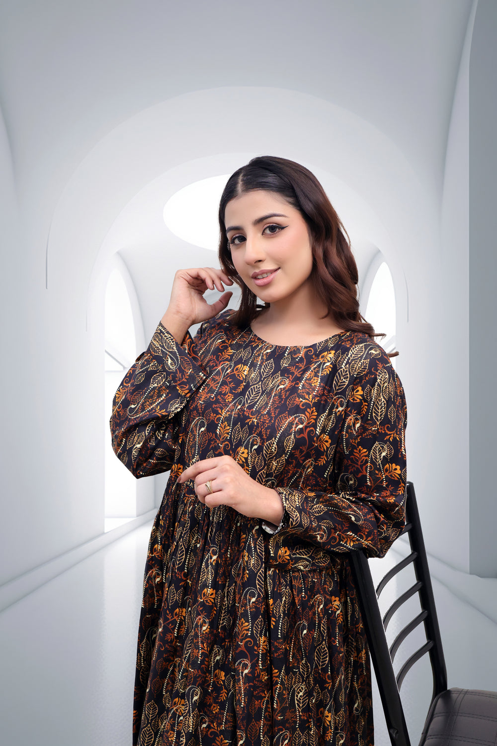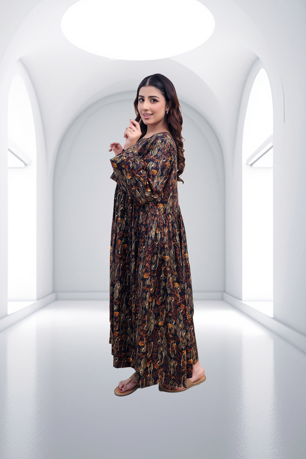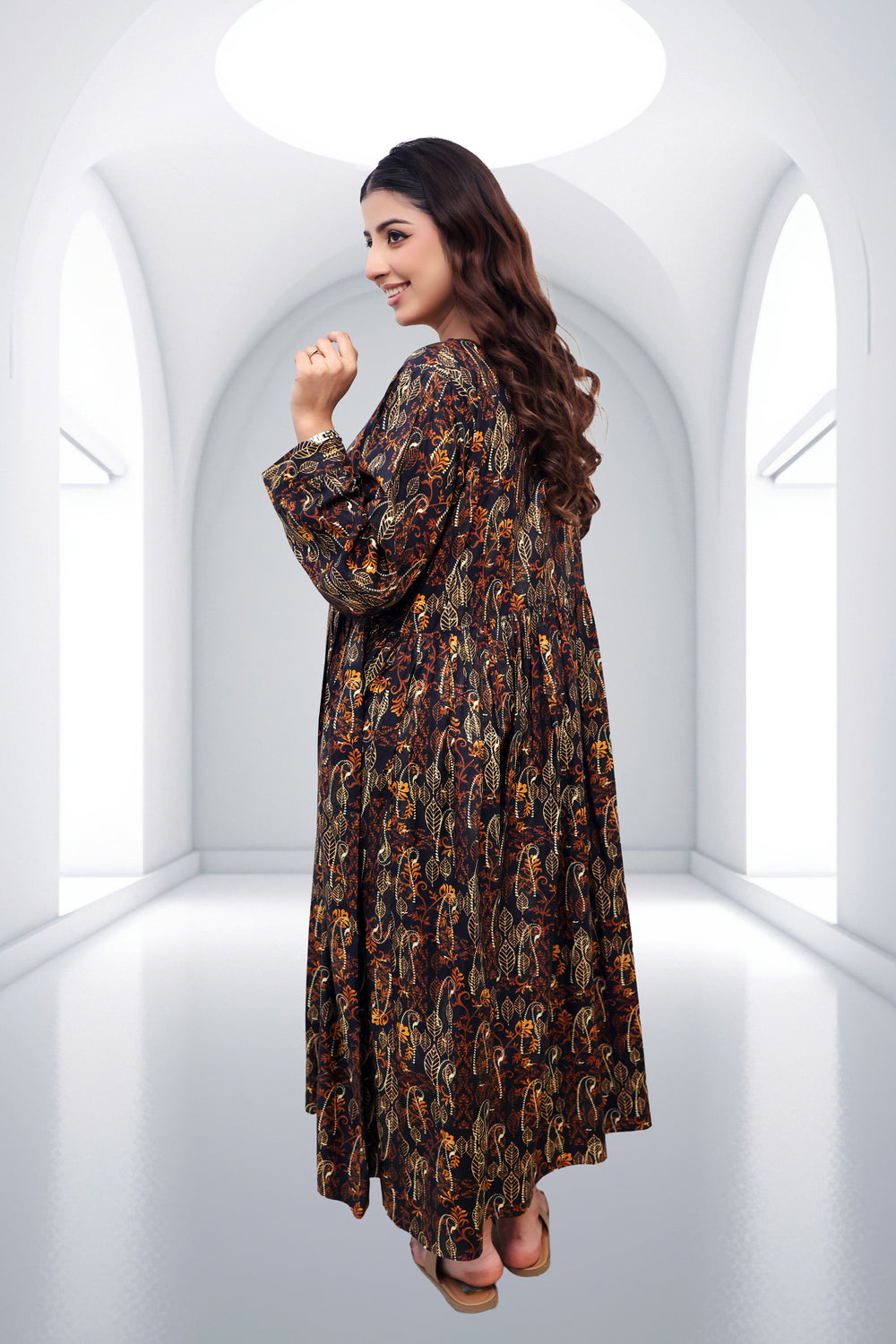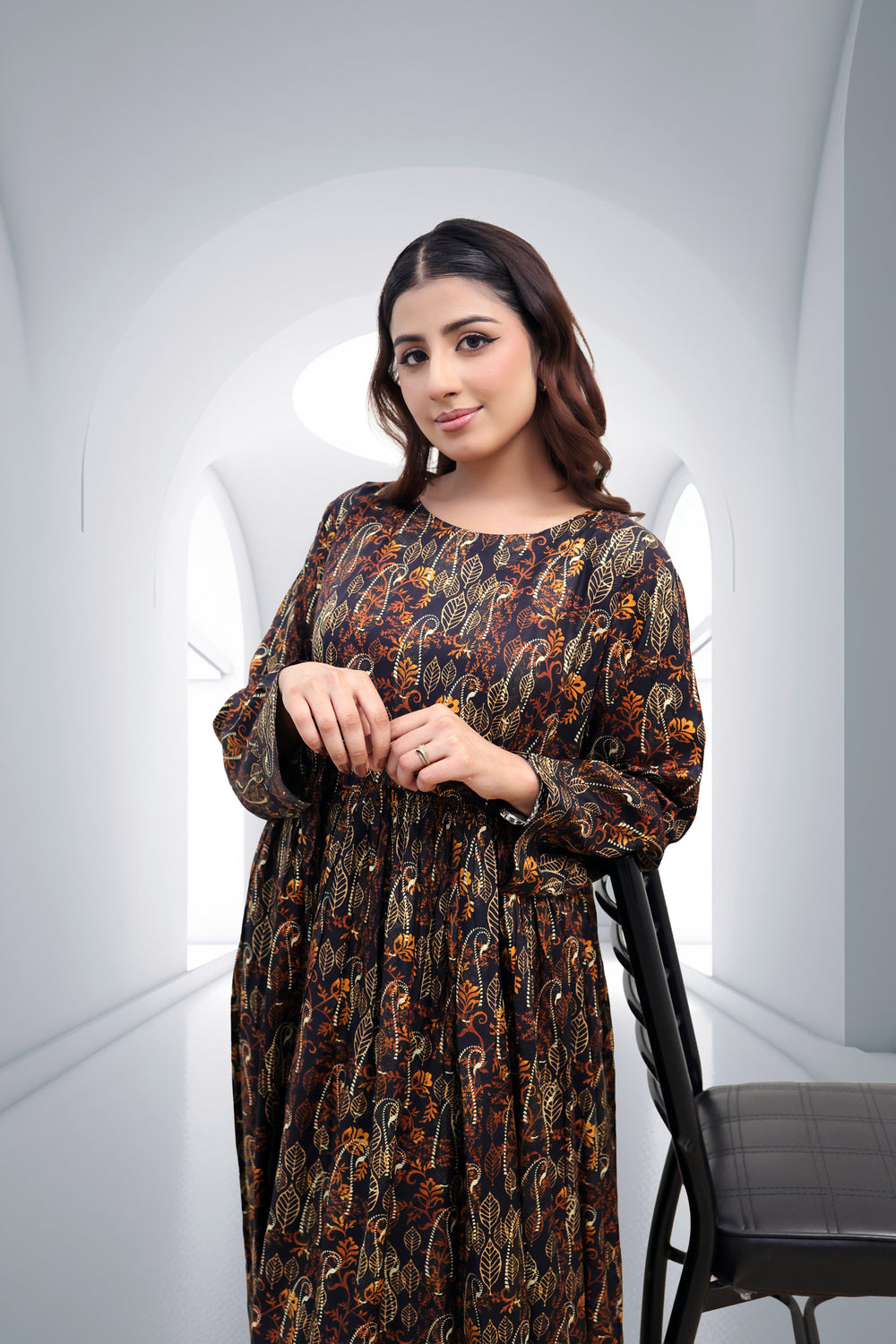 Step into effortless elegance with our Midnight Amber Botanical Maxi. This stunning floor-length ensemble features an intricate, all-over golden-yellow and earthy-orange leaf pattern set against a deep obsidian backdrop. Crafted for the modern woman who appreciates traditional motifs with a contemporary silhouette, this dress is a versatile addition to any wardrobe.